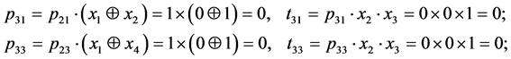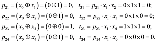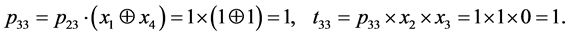 It is obvious that all t2j have zero value. As long as values of the following tij depend on p2j, we will determine terms only for those values j, where p2j has value of one, thus j = 1 and j = 3. The length of the sequence i = 3, S0 = {0, 0, 1}. Let’s find terms for j = 1 and j = 3.