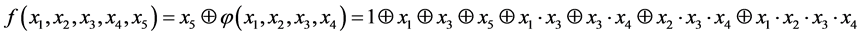 Therefore, for X = {0, 1, 1, 0, 1}, f1(X) = 1, it means code w = 13 isn’t a minimum in its ring. Let’s make sure that it is true. We obtain a ring by cyclic shift: {13, 26, 21, 11, 22}. Here we can see that the minimal value in this ring is 11, not 13. Table 3 shows the result of construction of the feedback function for a 5-bit shift register with minimal repetitive cycle.
