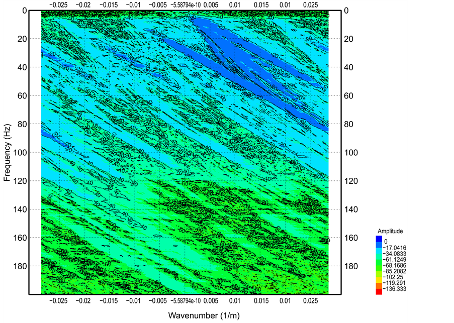 Figure 5. Frequency-amplitude (left) and F-K (right) spectrum for combined stack data. VSP shows frequencies up to 80 Hz at TD.