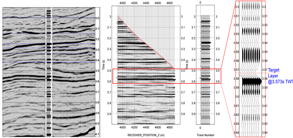 Figure 7. Final deconvolved upgoing wavefield (Zero Phase) and aligned in two way time (TWT). The target layer is identified on VSP data.