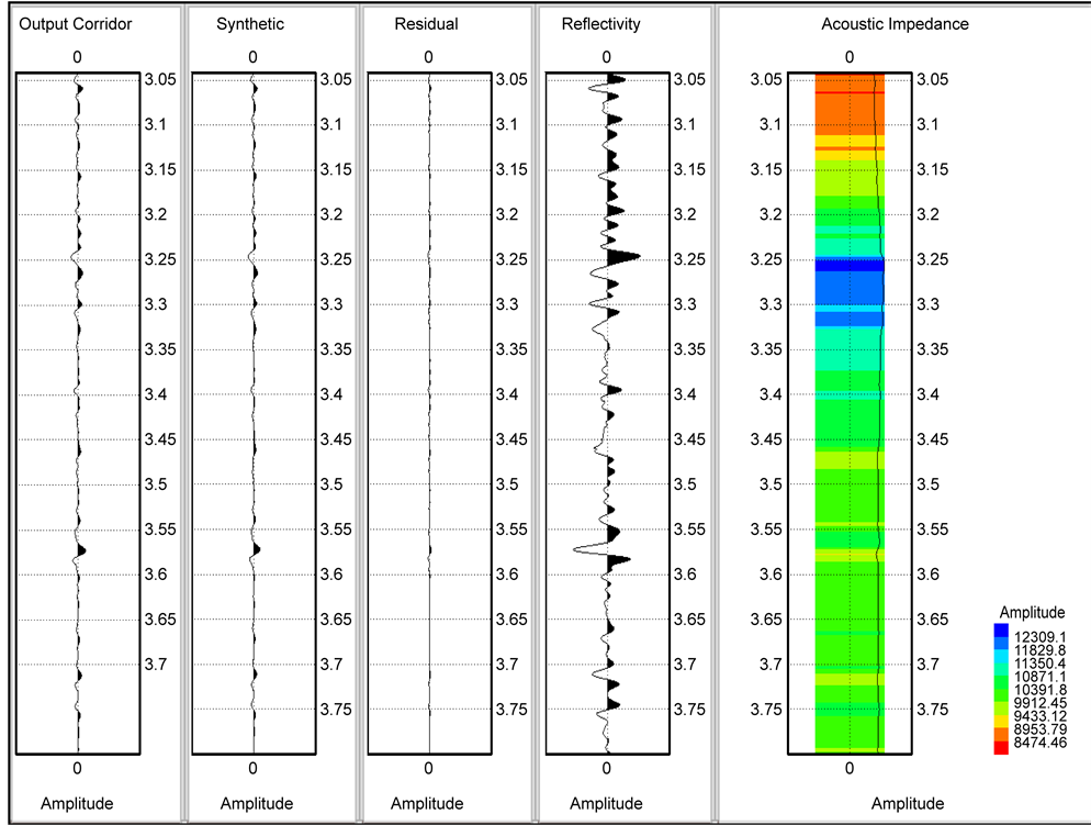 Figure 8. VSP inversion process. It shows the corridor stack, synthetic and the residual between the corridor stack & synthetic along with reflectivity and acoustic impedance.