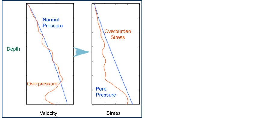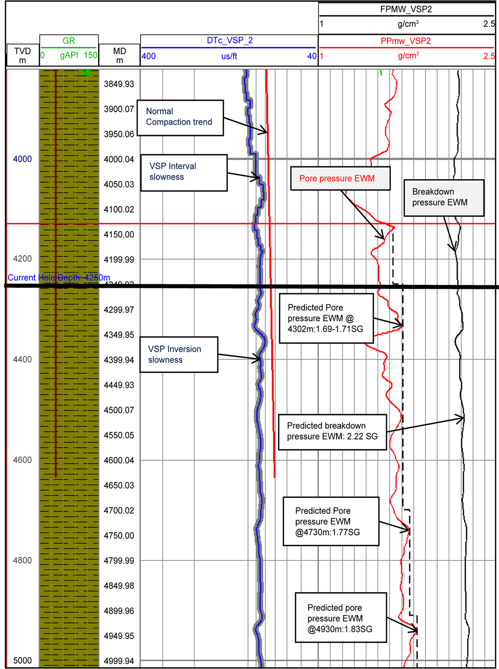 Under-compaction of formations is one of the major causes of over-pressured formations and is one of the type of pore-pressure mechanisms. This type of over-pressure can easily be picked by the acoustic measurement as the over- pressure manifests itself in drop in velocity as shown in Figure 3. The inverted velocity from VSP is then used to predict the pore-pressure and mud weight for next section drilling. Various transforms are available and can be used for velocity to pore-pressure transform. We integrate the VSP & Geomechanics to derive the pore-pressure and mud weight. The inverted velocity is combined with Geomechanics and drilling parameters are derived.