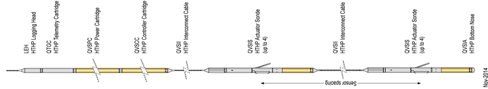 In HPHT environment, QVSI* is the latest generation of VSI* Versatile Seismic Imager tools developed by Schlumberger to acquire high quality tri-axial borehole seismic data in extreme environment wells. The QVSI* tool uses the Q-Technology* single-sensor hardware and software and advanced wireline telemetry for fast digital seismic data transmission from borehole to surface. QVSI is a high-temperature, high-pressure array tool design that focuses on tri-axial vector fidelity and efficient data acquisition, extending the limits in a 4-tool configuration to 500˚F (260˚C) and 30 kpsi (207 MPa). Figure 2 shows the tool string for QVSI*.