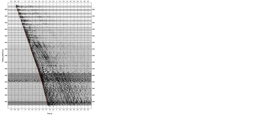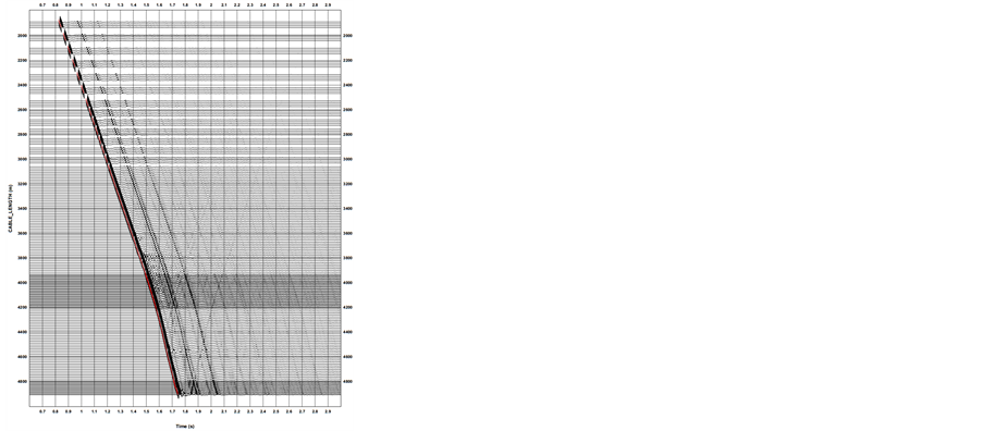 close to 204˚C. The client faces a challenge to drilling safely through the over- pressured formations in two different sections. It was critical to accurately predict the depth of target layers and predict pore pressure. The VSP data was acquired in two sections in two different runs by using QVSI*. A tri-axial component (XYZ) data with excellent data quality was acquired in both the runs. The combined stack data for two VSP runs is shown in Figure 4. The stack data quality is excellent with clear first break, flat background and excellent repeatability between the two VSP runs. The data shows high frequency bandwidth, with the effective bandwidth ~80 Hz at total depth of the well. Figure 5 shows the frequency-amplitude spectrum for the combined stack data.