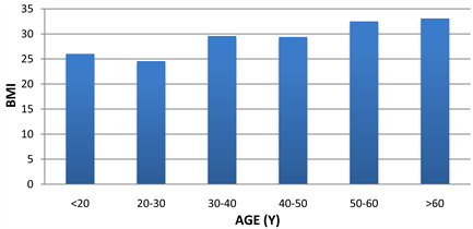 Age groups versus BMI in 226 patients revealed that the highest registered BMI (33.1 kg/m2) for the age group above 60 years old. The age group from 50 to 60 years old was close to the age group of patient who are above 60 years old and it was 32.5 kg/m2. These patients in these groups suffer from obesity (Note that: the obesity in BMI is between 30 to 40 kg/m2). The patient who are in the age groups less than 20, 30 to 40 and 40 to 50 years old see their numbers are very close together and were 26.0, 29.4 and 29.6 kg/m2. The age group of patient who are between 20 to 30 years old has a normal weight as shown in Figure 1.