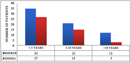 According to the different parameters demonstrating the period of smoking it was found that many smokers recently started smoking from 1 to 5 years which is 35 cases, and we report 27 cases of Shisha from the whole sample. It was also found that 21 smokers who have been smoking from 5 to 10 years and another 15 cases reported to smoke Shisha for more than 5 to 10 years and more than ten years of smoking were 12 cases of cigarette smokers and 3 cases of shisha smokers. However, this indicates more than 50% of our samples are smoking 1 to 5 years. Accordingly, the effect of long period smoking has the least cases percentage in our study which creates a limitation which needs further investigation with expansion and focus on this category Figure 4.