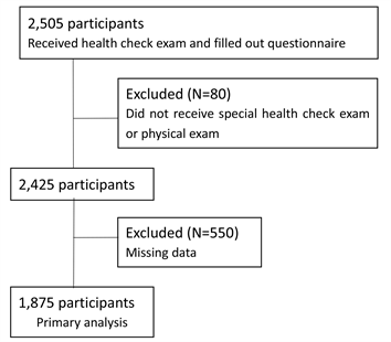 Of the 2505 participants in the LOHAS baseline survey, 80 participants who did not receive special health check exam or physical exam and 550 participants who had at least one missing value were excluded. This left 1875 subjects to be ultimately enrolled in the present study for analysis (Figure 1). The characteristics of the study population are described in Table 1. The subjects included in this study were more likely to be older, male, smokers, and have a higher prevalence of hypertension history.