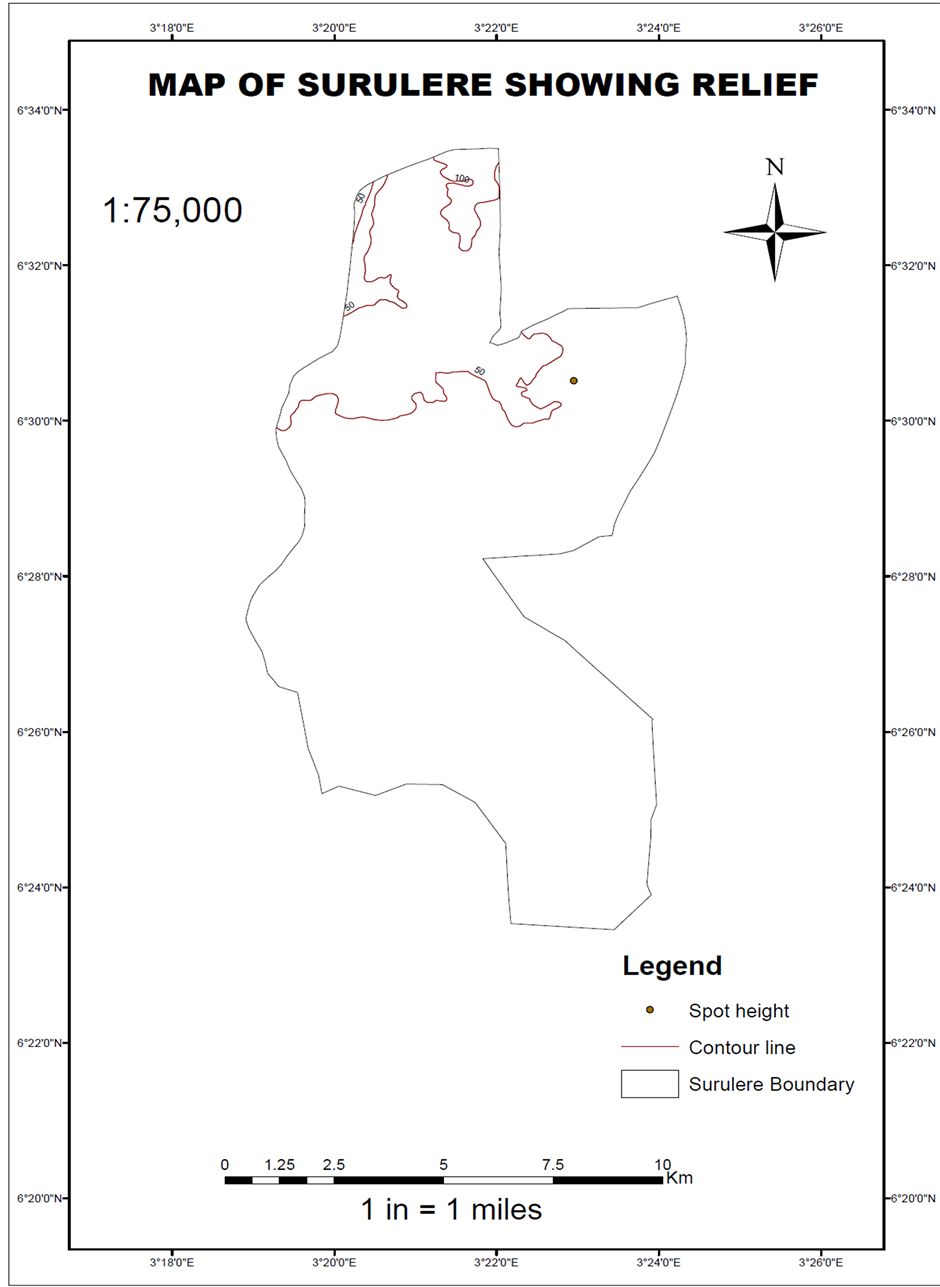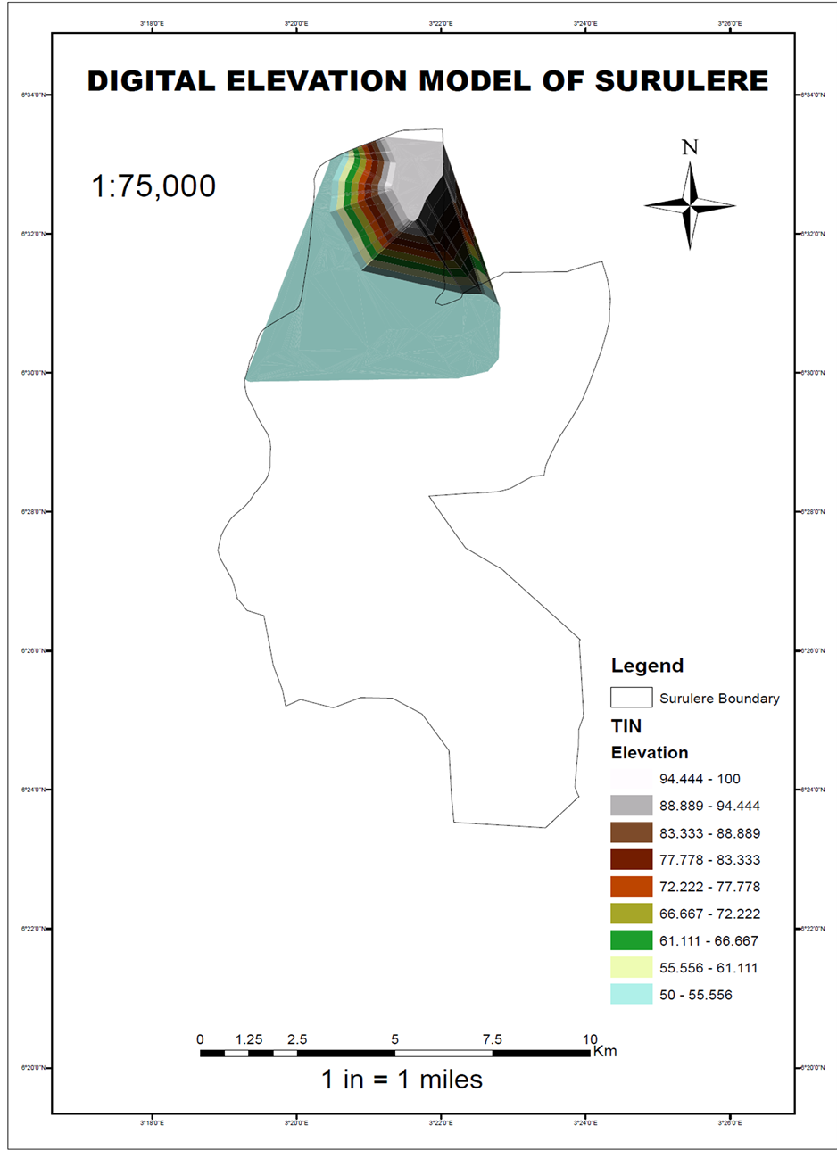 Figure 6 displays the topography of the study area. The relief and DEM maps generated show that Surulere is a relatively flat land, with the highest elevated peak at 100ft (See Figure 7 and Figure 8). Majority of the land area is below 50ft (15 m); some areas are even as low as 30ft. Therefore, it can be classified as a lowland, thus making it difficult for accumulated water from rainfall to flow to the lagoons and creeks.