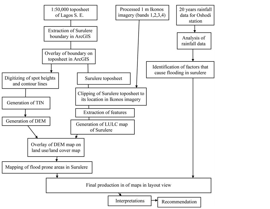 intensity. Also, the relief of Surulere, (which is relatively lowland) contributes as it prevents water discharge to the sea. Due to the poor infrastructural planning, buildings often block natural water drainage systems and roads constructed without drainage prevents rainwater from flowing out. Thus, it has become necessary to identify the immediate and indirect causes of flooding in Surulere, and map out the parts of the LGA that are more susceptible to flooding using GIS, so as to proffer solutions to the flooding situation in Surulere.