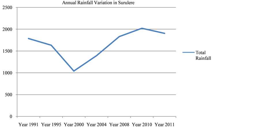 Table 2 shows that the rainfall amounts over the period covered is relatively high. In the Figure 5 below, it can be seen that over the years, Surulere has experienced a steady rise in annual rainfall, although there was a decrease between year 1995 and 2000. However, there has been a steady increase ever since and the trend is most likely to continue due to global warming.