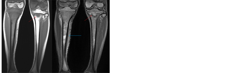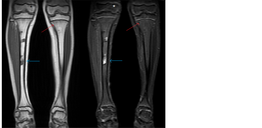 Figure 2. MRI of bilateral legs. Denoted by the blue arrow is the periosteal defect in the right tibal shaft, correlating with the patient’s mass. Denoted by the red arrow is abnormal signal in the left tibia. The star marks normal bone signal in the right distal femur, as compared to the abnormal signal in the left distal femur.