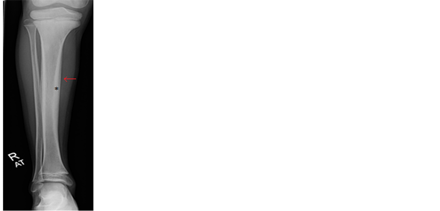 Figure 1. X-ray of tibia and fibula Periosteal elevation is denoted by the arrow and cortical thickening by the star.