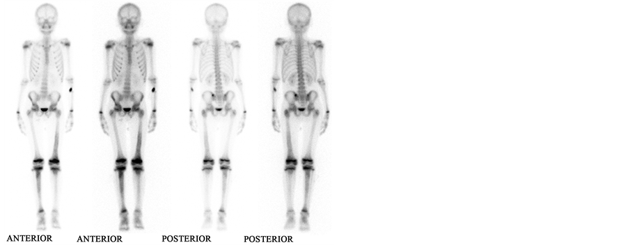 Figure 3. Bone scan demonstrating abnormal uptake in entire right tibia, mid and distal left femur, left femoral head and neck, and left tibial diaphysis.