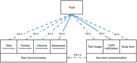 Not only the direct communication but also knowing the situation of other members may affect the trust building. To examine the effect of the non-text communication available environment for trust building, the following hypotheses and three sub-categorized hypotheses are tested.