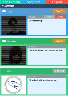In addition to GMSS, a non-text communication tool, called C-WORK, will be provided to treated groups. C-WORK is a web-based non-text communication platform [24]. It has three functions: exchanging members’ snapshots, log-in status information, and a short text message board. Snapshots are taken by a worker’s built-in PC camera or connected web camera. To protect the privacy of users, the reciprocity concept is applied in C-WORK, i.e., a user can see the other members’ picture in C-WORK only when s/he turns on her/his camera. As an additional privacy protection, pictures are shown as if they are looked through a shade. Figure 2 shows the user interface of C-WORK. The picture is automatically updated every minute. A user can also manually update the picture by pressing the “Snapshot” button. Log-in status information is used to know who is logged in now. When the user is logged in, the log-in status is turned to orange and message is turned to “I’m in”. Otherwise, the log-in status is displayed in gray and a message is shown as “I’m Out”. A short text message is expected to be used for sharing a user’s situation such as “I’ll be back at 2 p.m. tomorrow.” Once a user posts the message, the previous message is deleted, and other users cannot see previous messages. C-WORK provides log-in information, a snapshot, and a message board. The former two items are treated as