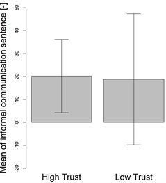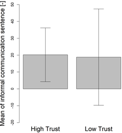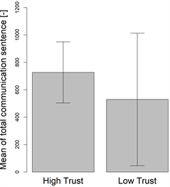 To examine the difference between these two groups, amounts of communication of each type were compared. Figure 6 shows the difference of the mean of total communication sentences between two groups. Although there was no statistically significant difference (p = 0.368), the high trust score group (726.8) was more communicative compared to the low trust score group (529.4). Figure 7 shows the difference of mean of formal communication between two groups. Again, while there was no statistically significant difference (p = 0.451), the high trust score group (650.6) communicated more than the low trust score group