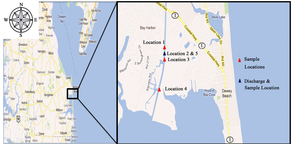 Sample locations were selected as follows: one location directly at the municipal wastewater treatment facility discharge (Location 5), one location seven meters in front of the discharge, where the discharge water is received directly into the brackish tidal canal (Location 2), two more locations, each approximately fifty meters from the effluent on both the northern (Location 1) and southern side (Location 3), and a control location near the end of the canal (Location 4), approximately 800 meters away from the discharge, in proximity to the mouth of the Rehoboth Bay (Figure 2). Water samples were collected weekly in the summer months and bi-weekly in the fall and winter months of 2011, for the period of thirteen months. All samples were analyzed in triplicate to ensure data accuracy.