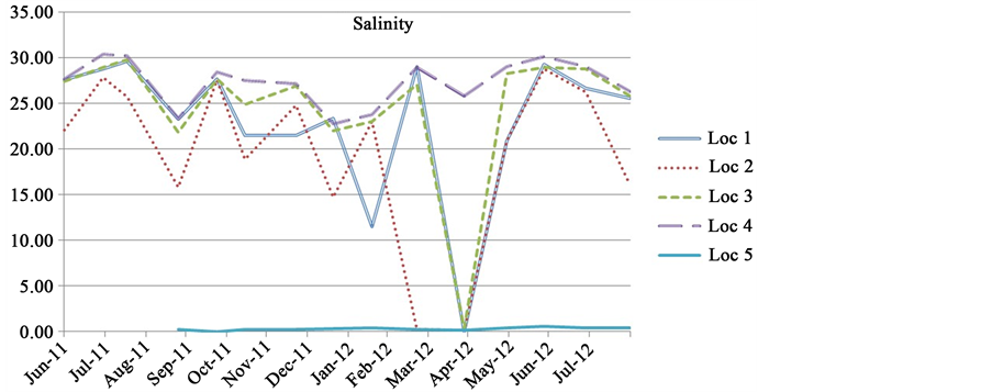 Field monitoring results included temperature, dissolved oxygen, pH, salinity, and total dissolved solids for the months June 2011 through August 2012. Temperature displayed expected temporal trends that indicate changes in season. The mean temperature in summer 2011 was 27.5˚C, while it was 7.9˚C in winter 2011. An exception to seasonal variation was recorded at location 5 (waste water discharge location), where temperatures consistently remained somewhat higher than the other locations (10.73˚C in winter 2011). Dissolved oxygen of a healthy aquatic ecosystem in this temperature range can be sustained at anywhere from 60 - 120 percent saturation [18] .