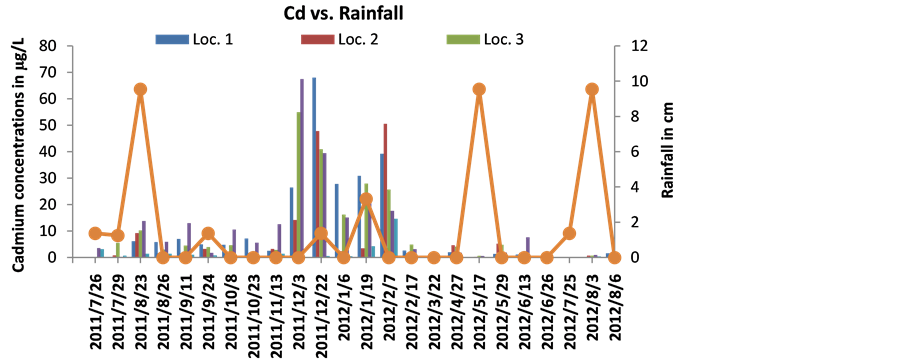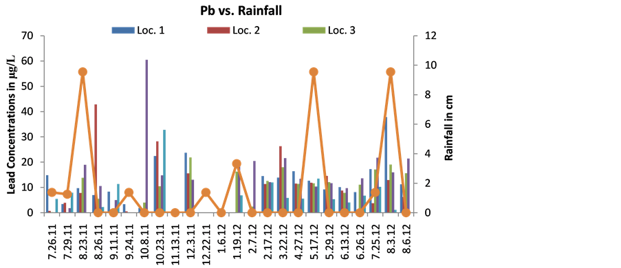 Lower levels of Pb are seen in the data when rainfall levels are higher. The same result is found for Cd, but it was more pronounced for Cd (Figure 6(a) and Figure 6(b)). This is thought to be attributed to road dust sediment adsorption of metal ions in colloidal particles. Adsorption of the metal ions makes them less available in solution [27] , as shown by the graph data above.