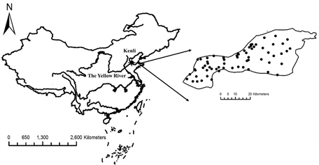 The experiment was conducted in the typical agricultural county in Yellow Riverdelta, Kenli (118˚24' - 119˚10'E, 37˚21' - 38˚9'N) (Figure 1). Kenli County has a warm, temperate, semi-humid monsoonal climate, with an average annual air temperature of 11.9˚C and an average rainfall of 592.2 mm. The soil in Kenli is classified as Salic Fluvisol, according to the FAO-UNESCO system. Andthe main crop in Kenli is cotton.
