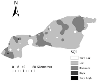 Soil quality was divided into five grades: very high (SQI ≥ 0.85), high (0.85 > SQI ≥ 0.7), moderate (0.7 > SQI ≥ 0.55), low (0.55 > SQI ≥ 0.4), and very low (SQI < 0.4), according to the classification criteria [12]. Spatial variability analysis of soil quality was carried out using geostatistical analysis software (ArcGIS 10.2). The interpolation method used was the inverse distance weighting.