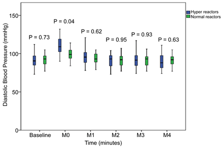 among both hypertensive and normotensive subjects. We can see that immediately after cessation of cold exposure, SBP increased significantly in hyper-reactors compared to normo-reactors in both groups (176 ± 20 vs. 154 ± 11, p = 0.01 and 148 ± 17 as against 125 ± 11, p < 0.001, respectively for hypertensives and normotensives). SBP stayed higher in hyper-reactors up to 2 minutes after cold exposure, but the difference was not statistically significant. Similarly, Figure 3 and Figure 4 show that DBP, 0 minute after stopping stress exposure was statistically higher in hyper reactors than in normal reactors (111 ± 13 vs. 99