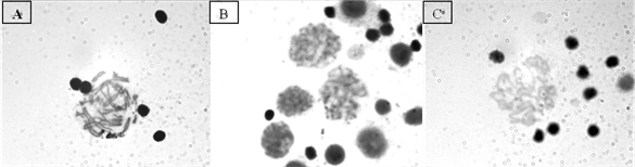 Figure 2. Metaphases. (A) With 10 μl of phytohemagglutinin; (B) With 20 μl of phytohemagglutinin; (C) 30 μl of phytohemagglutinin.