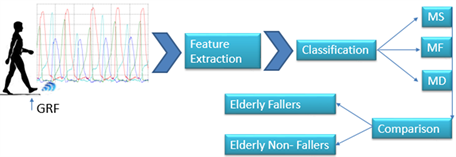 The recorded signals are 4 signals from both the right and left foot. The impact and active peaks of each signal are being separated by first differencing. Then a set of features from both time and frequency domain are extracted to form input to a classifier. A comparison in the results is then conducted between elderly fallers and non-fallers. Figure 2 summarizes the flowchart of the algorithmic work followed in this paper.