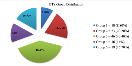 The majority of the subjects belonged to OTS group 3 (40.4%) followed by OTS group 2 (20.2%) (Figure 1).