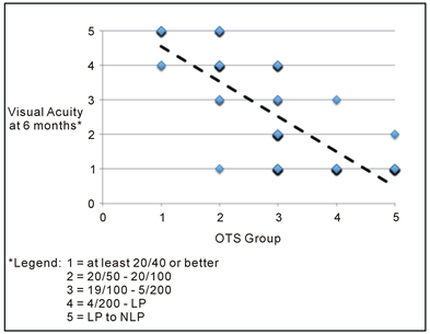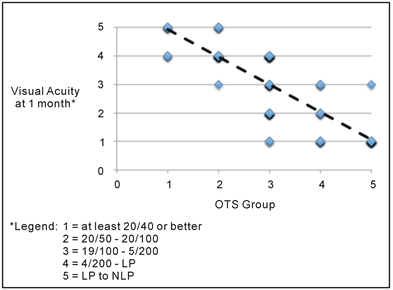 The most common visual acuities during each of the 3 follow-up periods are as follows: 4/200 to LP at 1 month and at least 20/40 or better at 3 and 6 months. In all months, there was a statistically significant positive correlation between the OTS grade and corresponding VA, with a correlation coefficient highest at the first month (R = 0.700, p =< 0.0001), followed by month 3 (R = 0.633, p =< 0.0001) then at month 6 (R = 0.612, p =< 0.0001) (Tables 6-8 and Figures 2-4).