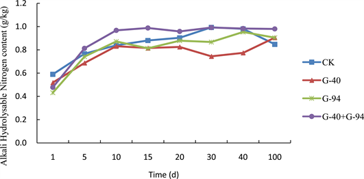 The content of alkali hydrolysable nitrogen is shown in Figure 1. As can be seen from Figure 1, with the increase of time, the content of alkali hydrolysable nitrogen in the 3 treatment groups increased from 1th to 10th d. The content of alkali hydrolysable nitrogen was 0.839, 0.832, 0.872, 0.968 g/kg of CK, G-40, G-94 and G-40 + G-94, on the 10th d, respectively. After that, the change of the content of alkali hydrolysable nitrogen was not obvious until 100th d. The content of alkali hydrolysable nitrogen reached 0.848, 0.905, 0.905, 0.980 g/kg on 100th d, which was 1.05%, 8.78%, 3.75%, 1.33% higher than that of CK, G-40, G-94 and G-40 + G-94, on the 1th d, respectively. From the beginning of 10th d, the content of alkali hydrolysable nitrogen of the G-40 + G-94 treatment group was higher than that of the G-40 and the G-94 treatment groups.