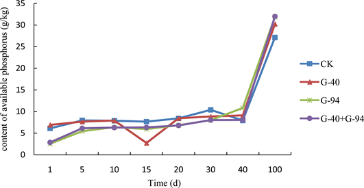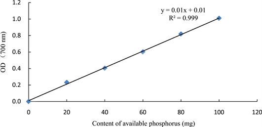 The content of available phosphorus is shown in Figure 2. P standard curve can be seen from the Figure 3. As can be seen from Figure 2, the content of available phosphorus in the 3 treated groups did not change basically from 1th to 40th d. After 40th d, the content of available phosphorus rose sharply. The content of available phosphorus was 6.105, 6.924, 2.569, 2.870 g/kg of CK, G-40, G-94 and G-40 + G-94, on the 1th d, respectively. The content of available phosphorus reached 27.158, 30.247, 31.887, 31.997 g/kg on 100th d, which was 344.85%, 336.84%, 1141.22%, 1014.88% higher than that of CK, G-40, G-94 and G-40 + G-94 on the 1th d, respectively.