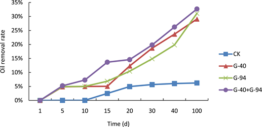 G-40 + G-94 treatment group is higher than that of the G-40 and the G-94 treatment group from 15th to 100th d. The oil removal rates of G-40, G-94 and G-40 + G-94 treatment groups were 29.08%, 31.09% and 32.68% on 100th d, respectively.