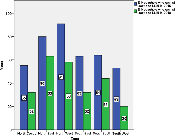 Figure 1. Bar chart showing LLIN ownership across the six geo-political zones in 2010 and 2015.
