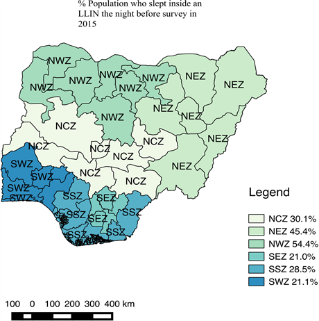 Table 4. ANOVA of household who slept inside an LLIN the night before survey in 2015 and malaria prevalence (slide positivity rate) in 2015 across Nigeria.