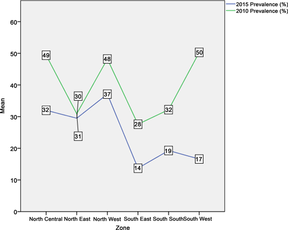 Figure 4. Line graph showing prevalence of malaria across the six geo-political zones in 2010 and 2015.