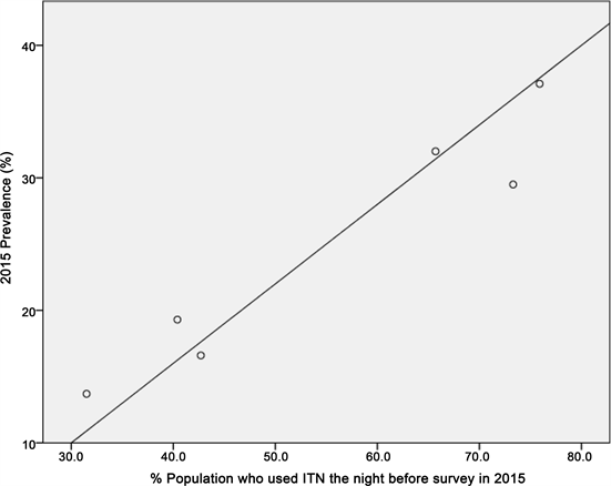 aPredictors: (Constant), % Population who slept inside an LLIN the night before survey in 2015, % Household who own at least one LLIN in 2015. bDependent Variable: 2015 Prevalence (slide positivity rate) %.