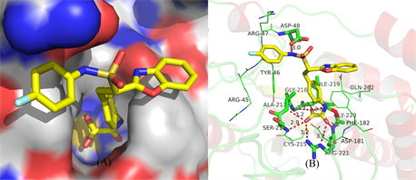 Figure 2. (A)-(B) show docking structure of compound 19 and the corresponding surface of PTP1B(A). Interaction between the PTP1B active binding site and compound 19(B). Hydrogen bonds are depicted by red dotted lines.