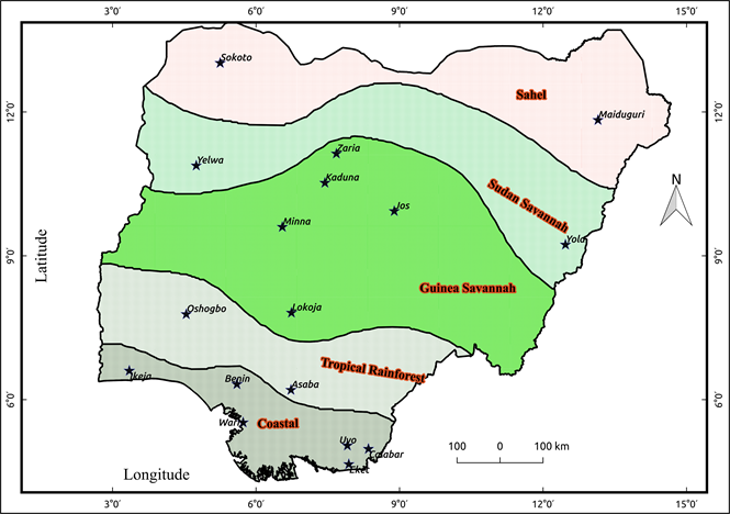 and the Sahel. These drought periods are indications of the great variability of climate across tropical Africa and across Nigeria, the most serious effects of which are usually felt at the drier margins of agricultural zones or in the regions occupied primarily by pastoral groups. Although average temperatures vary little from coastal to inland areas, except the North East of Nigeria which has greater extremes [40] . Nigeria was selected in this study because of its exposure to extreme events such as droughts and heat waves recorded in 2016 in Lagos and because it covers five climatic zones in West Africa. Nigeria could then be representative of the West Africa.