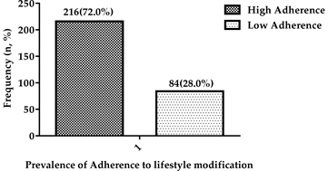 Figure 1 shows the prevalence of adherence to lifestyle modifications. Out of the 300 participants 216 (72.0%) of the participants were adherent to lifestyle modification whiles 28.0% were non adherent.