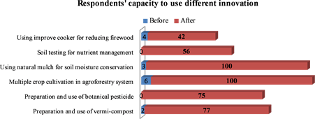 At the initial stage of project local innovations were collected by the field staff of the research team. Two innovations (preparation and use of vermin-compost & botanical pesticide) were chooses from the previous project of the research team. Rest of the innovations was chosen for this project based on their suitability with the local condition as well as relevancy with research objectives. A summary of using capacity of the selected innovations are presented in Figure 4.