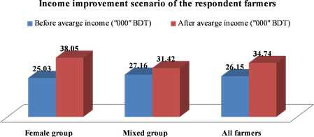 Table 3 also shows that the average farm size of the respondent farmers was 0.39 ha and it was relatively bigger among the members of the mixed group. It is evident from the findings that the farmers are either marginal or small farming categories. The study also explored that the average annual family income of the respondent farmers was 26.15 thousand BDT (Bangladeshi Currency; 1US$ = approx 80BDT). Like farm size, mixed group had better average annual family income compared to female oriented group.