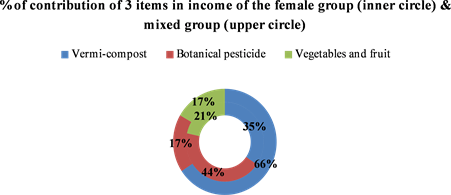 Figure 7 exhibits that in case of female groups highest contribution (44 percent) was from botanical pesticide. Next to botanical pesticide 2nd highest contribution (35 percent) comes from vermin-compost. Conversely, in case of mixed group highest contribution (66 percent) comes from vermin-compost. This is may be due to the reason that having male members in the group it was easier for them to collect cow-dung for preparing vermin-compost which was tougher in female oriented group. However, female member groups’ income was higher due to their better income from botanical pesticide and organic vegetable and fruit cultivations.