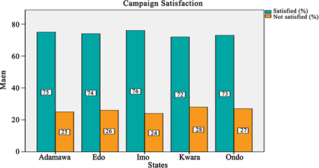 Figure 9 show responses from across the states about their satisfaction during the LLIN campaign. The responses revealed mean satisfaction rate of 74% (95% CI, 72.8% - 75.2%) on how the campaign was conducted leaving a handful 26% (95% CI, 24.8% - 27.2%) not satisfied with the process.