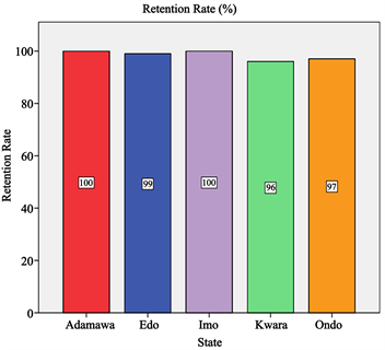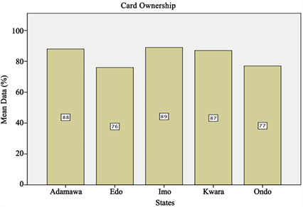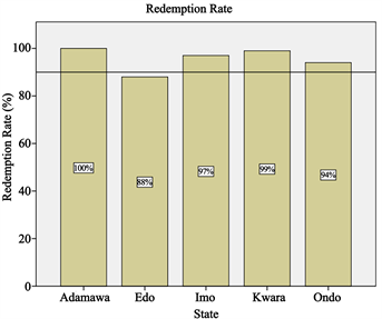 A total of 9740 eligible persons were interviewed from 1200 HHs across the five states. The descriptive statistics in Table 1 shows the mean values for redemption rate 95.60% (95% CI, 91.60% - 98.79%), retention rate 98.4% (95% CI, 97.0% - 99.8%), hanging rate 82.58% (95% CI, 81.02% - 84.20%), card ownership 83.4% (95% CI, 78.6% - 88.2%), and net usage 71.78% (95% CI, 70.80% - 72.68%). These rates are also displayed in Figures 2-6.