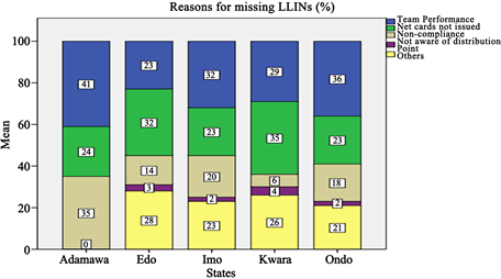 As shown in the findings from this study, the main source of information about the LLIN campaign was from the health workers 35.4% (95% CI, 21.8% - 49.0%) as documented in other studies [1] [22] . Thus, there is the need for the malaria community to consider the importance of community outreach, interpersonal communication, and social support on the adoption of net use behaviours when designing future interventions [24] [25] . While the two predominant reasons across the states for missing the LLINs were team performance 32.2% (95% CI, 26.8% - 37.4%) and net cards not issued 27.4% (95% CI, 23.2% - 32.0%), non-compliance was also significantly high in Adamawa state 35% (95% CI, 35% - 35%).