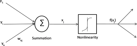 Artificial neural networks (ANN) are computational bright systems proven to mathematically copy the computational operations of the human brain. A neural network consists of a set of connected cells: the neurons [6] , which are made of basic units. It consists of three layers, they are; the input layer, the hidden layer, and the output layer. The independent variables are introduced into the network system by the input layer, transited to the hidden layer through the input neurons linked to the hidden neurons. Figure 2 shows a graphical presentation of neuron. That is, neuron is a real function of the input vector (yi, ∙∙∙, yk). F is a function, the output of the hidden layer is imbedded in the summing junction where standardization of the data is processed, where each input is multiplied by weights wkj along its path and the weighted inputs are then summed and biased by adding a value unto the weighted input. The output of the summation is sent into a function named transfer function and is used to map the processed data to the output data. This function classically falls into one of three types: Linear (or map), Threshold and Sigmoid. The output of the function block is fed to the output neuron and obtained as Equation (1) [7] . Various studies like [8] and [9] used the artificial neural network (ANN) in the prediction of HIV/AIDS