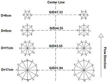 Experiments were carried out at the Quesnel River Research Centre, Likely, BC, Canada in a large-scale flume. The flume measures 40 m long, 2 m wide and 1.3m deep. The longitudinal slope of the flume bottom was 0.2 percent. A holding tank with a volume of nearly 90 m3 was located at the upstream end of the flume and provided a constant head in the experimental zone. Two valves were connected to the holding tank to allow for control of the flow velocity. At the end of the holding tank and upstream of the main flume, water overflowed from a rectangular weir into the flume. Since the flow of water was turbulent while entering the flume, a flow diffuser was placed downstream of the rectangular weir to dissipate the turbulence in the flow of water. Two sand boxes with the depth of 0.30 m were filled with a uniform sediment having a median particle size (D50) of 0.47 mm. The first sand box was 5.6 m in length and the second sand box was 5.8 m in length. The distance between the sand boxes was 10.2 m. Four different pairs of bridge piers with diameter of 6 cm, 9 cm, 11 cm and 17 cm were used (Figure 1(a)). Bridge piers were constructed from PVC plumbing pipe and were circular in shape. A pair of bridge piers were placed inside both sand boxes at a distance of 50 cm from each other and were fixed to the bottom of the flume. One pair of bridge piers were located in each sand box so two experiments were carried out simultaneously in each experimental run. Each pier was offset from the centre line by 25 cm, as illustrated in Figure 1(b). The water depth in the flume was adjusted by the position of the tailgates. In front of the first sand box, a SonTek Incorporated 2D flow meter was installed to measure the approaching flow velocity, water depth, and inflow discharge during the experiment. A staff gauge was also installed in the middle of each sand box