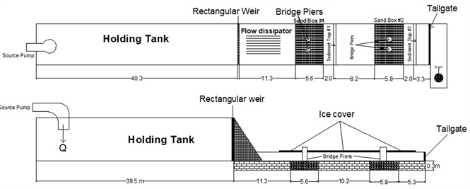Scouring can be defined as the process by which the particles of soil or rock around an abutment or pier of a bridge get eroded and removed to a certain depth (called the scour depth) [1]. The U.S. Federal Highway Administration (FHWA) has estimated 60% of bridge failure cases in the USA are due to scour and on average, approximately 50 to 60 bridges collapse annually in the USA [2]. Wardhana & Hadipriono [3] studied 500 failures of bridge structures in the United States between 1989 and 2000 and reported that the most frequent causes of bridge failures were due to floods, scour, and their cumulative impact. The average age of the 500 failed bridges was 52.5 years but ranged from 1 to 157 years old [4]. Brice & Blodgett [5] reported that damages to bridges and highways from major regional floods in 1964 and 1972 were equivalent to approximately 100 million US dollars per event. Bridge foundations should be designed to withstand the effects of scour. Bridge damage and failure have huge negative social and economic impacts in terms of reconstruction costs, maintenance and monitoring of existing structures, the disruptions of traffic flow, and in some life-threatening cases, the cost of human lives [4]. Moreover, a precise prediction of scour depth will not only help to prevent those bridge failures which are the consequence of under-estimation of scour depth but also will efficiently reduce unnecessary construction cost of those bridge piers in which scour depths are over-estimated. To safely design bridges located on waterways under severe flooding conditions, many researchers have developed a number of laboratory-derived equations for predicting bridge pier scour depth [6] [7] [8] [9] [10] [11] [12]. These equations are mostly empirical formulae which are usually based on regressional analysis of laboratory and/or field scour data. However, they differ from each other in terms of the factors considered in constructing the scour model, parameters used in the equation, laboratory and/or site conditions. Since the number of these equations is relatively large, selection of the best performing equations for a special case is a difficult task. Comparison studies of scour formulae especially for different flow conditions might be helpful to select the one with the best performance. Additionally, many rivers become ice-covered during the winter months. However, the winter season is often overlooked even though most rivers in Canada and northern parts of the United States, Europe, and Asia are annually affected by ice. The relatively smaller number of studies on the scour around bridge pier under ice-covered flow condition is due to the inherent difficulty in collecting field data while ice is present and complications in lab-based measurements as a result of different scales and of temperature effects [13]. Ice cover can significantly change the flow field and impact sediment transport in natural rivers. The formation of a stable ice cover effectively doubles the wetted perimeter compared to open channel conditions. This alters the hydraulics of the channel by imposing an extra boundary to the flow, causing the velocity profile to be shifted towards a smoother boundary (channel bed) and adding to the flow resistance [14]. Furthermore, ice cover can lead to issues such as ice jamming, flooding, restricting the generation of hydro-power, blocking river navigation, and affecting the overall ecosystem balance [15]. One of the latest studies on bridge pier scour under ice-covered flow condition was conducted by Hirshfield [16]. These experiments were conducted in a large-scale flume to study the impact of ice cover roughness and non-uniformity of sediment on the local scour around a single circular bridge pier under open channel, smooth ice and rough ice covered conditions. It was concluded turbulence intensity was greater under ice covered than open channel conditions. In addition, it was observed that local pier scour under rough and smooth ice cover was on average 37 and 20 percent greater than open channel scour depth, respectively [16]. Another significant study on local Scour around bridge piers under ice-covered conditions was carried out by Wu et al. [17]. In this study, the scour profile under an ice cover is compared with previous studies by examining the role of relative bed coarseness, flow shallowness, and pier Froude number. It was concluded the scour depth under an ice-covered conditions is larger than under open channel flow conditions. Further, the presence of the ice cover becomes more significant with respect to scour at shallower flow depths [17].
