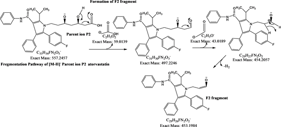 During this study, mass spectral data of atorvastatin was generated using electrospray ionization and collision induced dissociation; followed by interpretation, workflow [18] and basic rules were used for the interpretation of the full scan atmospheric pressure ionization mass spectra (MS), collision induced dissociation fragmentation spectra (MS/MS) and MS3 data.